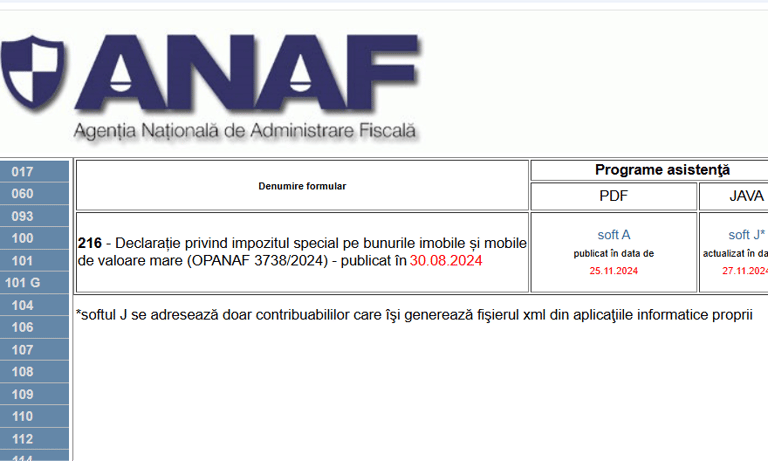 Declararea impozitului special pe bunurile imobile și mobile de valoare mare se realizează prin completarea și transmiterea formularului 216 „Declarație privind impozitul special pe bunurile imobile și mobile de valoare mare”, aprobat prin O.P.A.N.A.F. nr. 3738/2024.